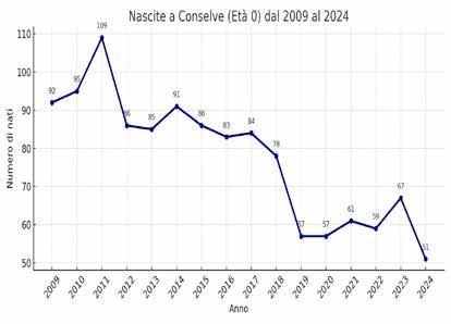 onselve non è immune al fenomeno dell’inverno demografico che colpisce l’Italia. I numeri parlano chiaro: se nel 2011 i residenti erano 10.307, al 31 dicembre 2023 il dato si è fermato a 10.012 per poi scende nel 2024 a 9.962, il più basso dell’ultimo ventennio. Ancora più preoccupante è il saldo naturale: nell’ultimo anno ci sono stati solo 51 nati contro 117 decessi, con una perdita di 66 unità. A compensare, solo in parte, il calo delle nascite è il saldo migratorio positivo (+16), ma la tendenza è ormai consolidata.