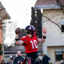 Lorenzo Piva è il quarterback dei Cavaliers Castelfranco. Per lui il football americano è una scuola di vita, una famiglia. Ed è anche un destino nato quasi per caso: “Un giorno mi imbattei in un video su YouTube di una partita e si accese qualcosa dentro di me. Ho scoperto che la squadra della mia città si allenava a meno di un chilometro da casa. Il resto è storia”. Un’avventura che dura da nove anni. Oggi Lorenzo guida l’attacco dei Cavaliers con la sicurezza di un veterano e l’ambizione di chi sa che il tempo stringe: “Questo potrebbe essere il mio ultimo ballo. Voglio chiuderlo con un anello al dito”. I Cavaliers hanno scritto pagine importanti nella storia recente del campio-