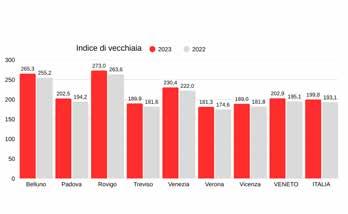 Guardando invece alle famiglie, quelle più numerose, con almeno tre componenti, rappresentano il 36,9% del totale. Tra le province venete, Treviso (2,36) ha il numero medio di componenti più alto e una percentuale significativa di famiglie con 4 e più componenti (20,8%). Anche Vicenza (2,31 componenti medi per famiglia) ha una percentuale di famiglie con 4 e più componenti superiore a quella regionale, seguita da Verona e Padova. Viceversa, Belluno è caratterizzata dalla più bassa dimensione familiare media (2,10) e un’alta incidenza di famiglie unipersonali (40,6).