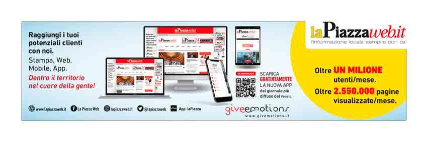 È un periodico formato da 23 edizioni locali mensilmente recapitato a 506.187 famiglie del Veneto. Direzione, Amministrazione e Concessionaria di Pubblicità Locale: via Lisbona, 10 · 35127 Padova tel. 049 8704884 · fax 049 6988054 >redazione@givemotions.it< >www.lapiazzaweb.it< Redazione: Direttore responsabile Nicola Stievano >direttore@givemotions.it< Redazione >redazione@givemotions.it< è una testata giornalistica di proprietà di Srl Periodico fondato nel 1994 da Giuseppe
