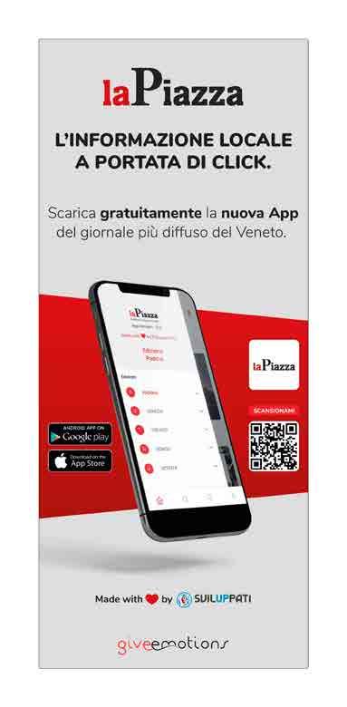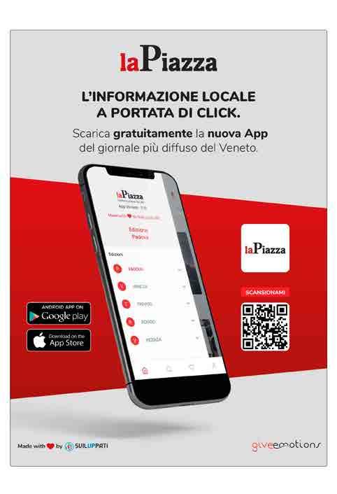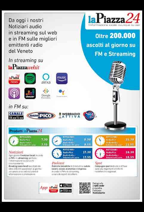 sia nel sito www.lapiazzaweb. it e sulle piattaforme streaming. “IlPunto” è uno spazio di commento politico dedicato agli argomenti più caldi del panorama nazionale e locale. “Zoom” esplora invece l’attualità, per capire e raccontare al meglio il Veneto che viviamo ogni giorno, con un’intervista in ogni puntata a un ospite competente e autorevole. Senza dimenticare le rubriche “Salute” e “Scuola&Lavoro”, che si possono ascoltare sia sul web sia in fm: si tratta di spazi podcast dedicati agli ambiti della salute, del benessere, dell’estetica, dell’istruzione, delle università. Con l’arrivo de LaPiazza24 è nato un vero e proprio sistema di comunicazione integrato, che ha aggiunto l’informazione audio a quella tradizionale dei mensili “La Piazza” e del sito “LaPiazzaweb”. E nel 2023 non mancheranno altre novità.