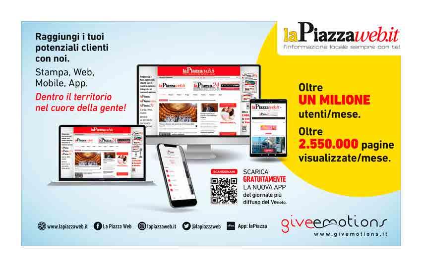 È un periodico formato da 23 edizioni locali mensilmente recapitato a 506.187 famiglie del Veneto. Direzione, Amministrazione e Concessionaria di Pubblicità Locale: via Lisbona, 10 · 35127 Padova tel. 049 8704884 · fax 049 6988054 >redazione@givemotions.it< >www.lapiazzaweb.it< Redazione: Direttore responsabile Nicola Stievano >direttore@givemotions.it< Redazione >redazione@givemotions.it< è una testata giornalistica di proprietà di Srl Periodico fondato nel 1994 da Giuseppe