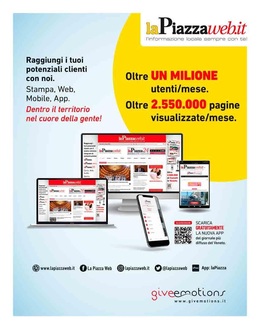sia nel sito www.lapiazzaweb. it e sulle piattaforme streaming. “IlPunto” è uno spazio di commento politico dedicato agli argomenti più caldi del panorama nazionale e locale. “Zoom” esplora invece l’attualità, per capire e raccontare al meglio il Veneto che viviamo ogni giorno, con un’intervista in ogni puntata a un ospite competente e autorevole. Senza dimenticare le rubriche “Salute” e “Scuola&Lavoro”, che si possono ascoltare sia sul web sia in fm: si tratta di spazi podcast dedicati agli ambiti della salute, del benessere, dell’estetica, dell’istruzione, delle università. Con l’arrivo de LaPiazza24 è nato un vero e proprio sistema di comunicazione integrato, che ha aggiunto l’informazione audio a quella tradizionale dei mensili “La Piazza” e del sito “LaPiazzaweb”. E nel 2023 non mancheranno altre novità.