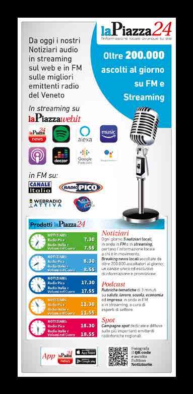 sia nel sito www.lapiazzaweb. it e sulle piattaforme streaming. “IlPunto” è uno spazio di commento politico dedicato agli argomenti più caldi del panorama nazionale e locale. “Zoom” esplora invece l’attualità, per capire e raccontare al meglio il Veneto che viviamo ogni giorno, con un’intervista in ogni puntata a un ospite competente e autorevole. Senza dimenticare le rubriche “Salute” e “Scuola&Lavoro”, che si possono ascoltare sia sul web sia in fm: si tratta di spazi podcast dedicati agli ambiti della salute, del benessere, dell’estetica, dell’istruzione, delle università. Con l’arrivo de LaPiazza24 è nato un vero e proprio sistema di comunicazione integrato, che ha aggiunto l’informazione audio a quella tradizionale dei mensili “La Piazza” e del sito “LaPiazzaweb”. E nel 2023 non mancheranno altre novità.