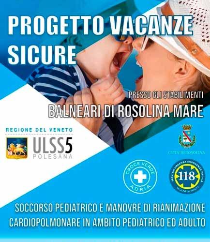 E’partito a luglio e si protrarrà fino al prossimo 28 agosto il progetto “Vacanze Sicure” che prevede, ogni lunedì e mercoledì, la presenza, nei diversi stabilimenti balneari di Rosolina mare, di operatori sanitari specializzati in materia di emergenza/urgenza. I professionisti forniranno nozioni di primo soccorso pediatrico e manovre di rianimazione cardiopolmonare in ambito pediatrico e per gli adulti. Il progetto, promosso dall’Azienda Ulss 5 Polesana in collaborazione con la rete di Urgenza ed Emergenza Medica 118 di Rovigo e Croce Verde Adria – Anpas, con il supporto del Comune di Rosolina, è aperto a tutti i turisti che vorranno partecipare ai vari appuntamenti.