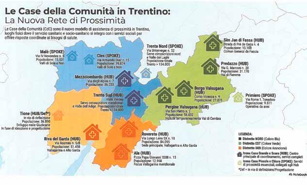 sociali. Le Case della Comunità sono pensate come luoghi dove la persona viene presa in carico nella sua interezza, considerando non solo la dimensione clinica, ma anche quella sociale, familiare e relazionale. In questa prospettiva si inserisce il percorso di evoluzione dei distretti verso un modello pienamente sociosanitario. In questo quadro, il volontariato e il terzo settore rappresentano un elemento distintivo e qualificante del modello trentino. La loro presenza all’interno delle Case della Comunità non è accessoria, ma strutturale: contribuiscono a costruire una rete di prossimità che va oltre la prestazione sanitaria, intercettando bisogni spesso invisibili e accompagnando le persone nei percorsi di cura. Il Trentino può contare su un tessuto associativo particolarmente radicato, fatto di or-