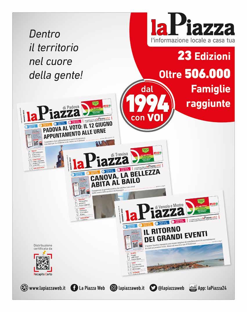 È un periodico formato da 23 edizioni locali mensilmente recapitato a 506.187 famiglie del Veneto. Direzione, Amministrazione e Concessionaria di Pubblicità Locale: via Lisbona, 10 · 35127 Padova tel. 049 8704884 · fax 049 6988054 >redazione@givemotions.it< >www.lapiazzaweb.it< Redazione: Direttore responsabile Nicola Stievano >direttore@givemotions.it< Redazione >redazione@givemotions.it< è una testata giornalistica di proprietà di Srl Periodico