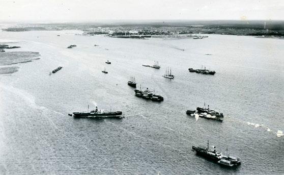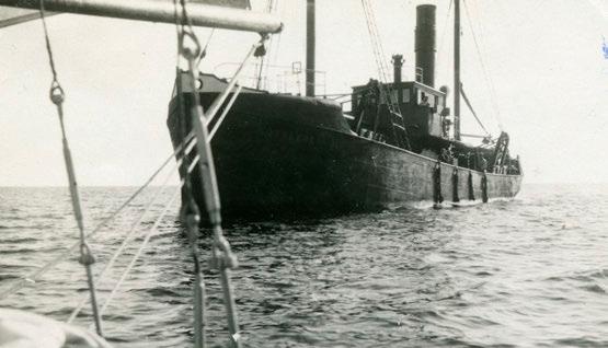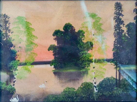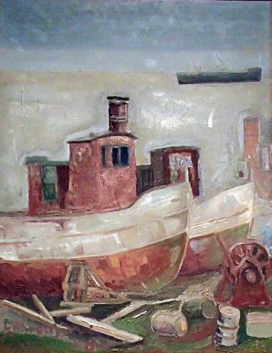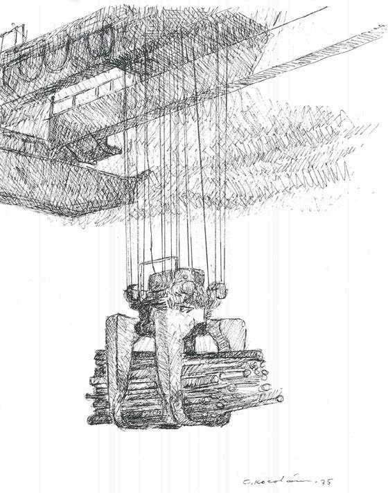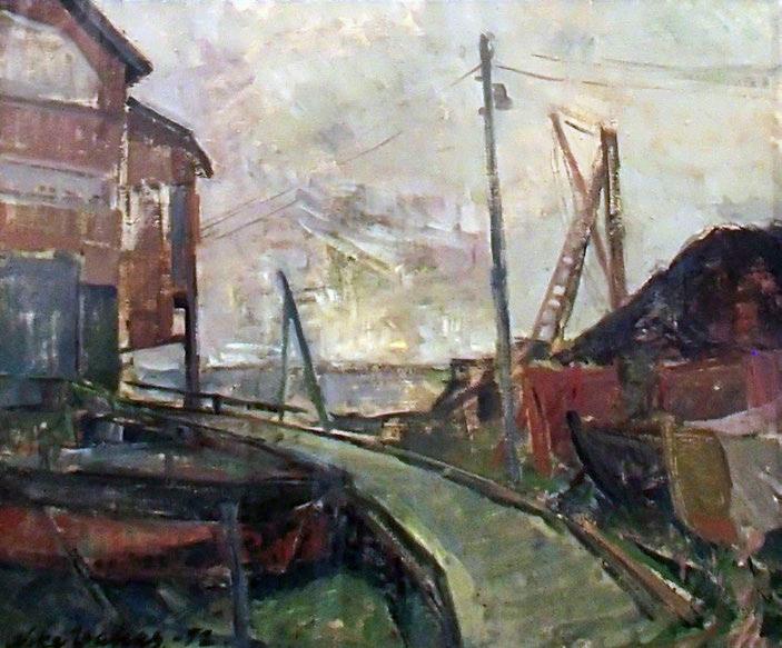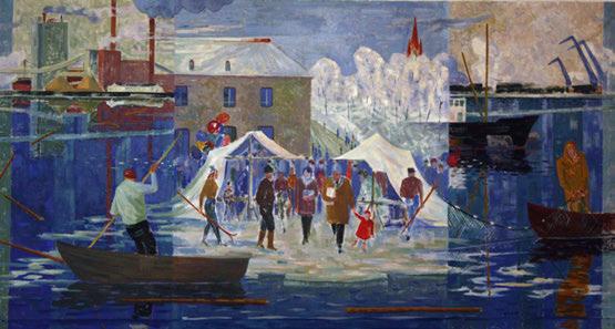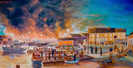 Kuva 50. Aleksi Suistio: Laitakarin lautatarhan suurpalo 1939 (1993) Tuli oli syttynyt höyryhinaajan kipinästä Tulipalo ei kuitenkaan levinnyt asuinrakennuksiin (Laitakari 2016, 381 ) Kuva Kimmo Arstio
