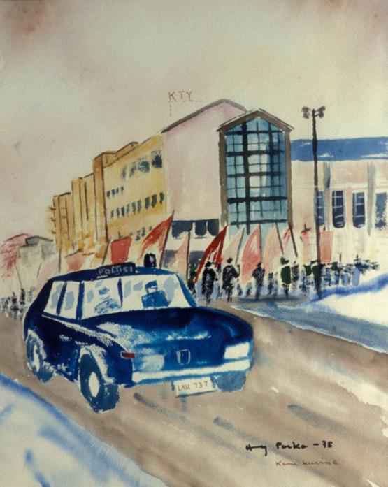 Kuva 52. Aleksi Suistio: Suojeluskunnan joukko-osasto lähdössä kirkkoon itsenäisyyspäivänä, 1935 (1989) Lottia on seuraamassa järjestäytymistä suojeluskuntatalon portailla Keltainen talo vasemmalla on Kemiyhtiön konttorirakennus, jossa oli myös asuinhuoneistoja (Laitakari 2016, 376 ) Kuva Kimmo Arstio