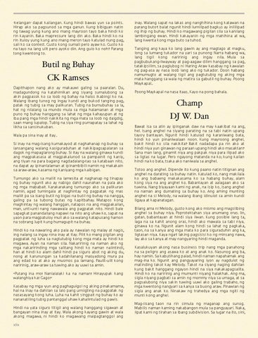 Butil ng Buhay CK Ramses Dapithapon nang ako ay makauwi galing sa paaralan. Du, madagundong na katahimikan ang siyang sumalubong sa akin pagpasok ko sa loob ng bahay na halos ikabingi ko na. Walang ibang tunog ng ingay kundi ang bukod tanging pag, patak ng tubig sa may palikuran. Tubig na bumubuhay sa la, hat ng nilalang sa mundo mula sa mga halamanan at mga puno ng buhay hanggang sa lahat ng mga kahayupan at ng iba pang mga hindi nakikita ng mga mata sa loob ng daigdig, saan mang lupalop. Tubig na siya ring pumapatay sa lahat ng likha sa sansinukuban. Wala pa sina inay at itay.. Si inay na mag-isang kumakayod at naghahanap ng buhay sa lansangang walang kasiguraduhan at nakikipagsapalaran sa dagok ng mapaglarong buhay. Si itay na walang ginawa kundi ang magpakasasa at magpakalunod sa pampainit ng kaniy, ang tiyan na para bagang nagdadalang-tao sa katabaan nito, na dapat ay ipinanlalaman at ipinambibili namin ng makakain sa araw-araw, kasama ng kaniyang mga kaibigan. Tumungo ako sa maliit na lamesita at naghanap ng tinapay ng buhay ngunit ako ay nabigo dahil naunahan na pala ako ng mga mababait. Karakarakang tumungo ako sa palikuran namin, agad tumingala at naghintay ng pagpatak ng mas maliit pa sa isang butil ng bigas na butil ng buhay na nangga, galing pa sa tubong butas ng kapitbahay. Matapos kong maghintay ng walang hanggan, natapos na ang magpakailan, man, unti-unti nang nawawala ang pagpatak nito. Hindi bale sapagkat panandaliang napawi na nito ang uhaw ko, sapat na yaon para magpatuloy muli ako sa walang katapusang hamon na sobrang lupit kung humagupit na buhay. Hindi ko na nawaring ako pala ay nawalan ng malay at nagis, ing nalang sa ingay nina inay at itay. Pilit ko mang pigilan ang pagpatak ng luha sa nagtutubig kong mga mata ay hindi ko magawa. Ayan na naman sila. Nakaririnig na naman ako ng mga nakaririnding mga salitang hindi ko naman naiintindi, han at hindi ko alam dahil hindi pa siguro abot ng aking du, nong at karunungan sa kadahilanang masyadong mura pa ang edad ko at ako ay musmos pa lamang. Paulit-ulit kong naririnig, araw-araw sa tuwing ako ay uuwi sa amin. “Putang ina mo! Nanlalalaki ka na naman! Hinayupak kang walanghiya ka! Gago!” Kasabay ng mga ‘yun ang paghagulgol ng aking pinakamama, hal na inay na dahilan sa lalo pang umiigting na pagpatak ng nasasayang kong luha. Luha na kahit singpait ng buhay ko ay nananatiling tubig pantanggal uhaw kahalintulad ng pawis. Hindi na yata siguro titigil ang walang hanggang sigawan at bangayan nina inay at itay. Wala akong kayang gawin at wala akong magawa, ni hindi ko magawang maipagtanggol ang xlix