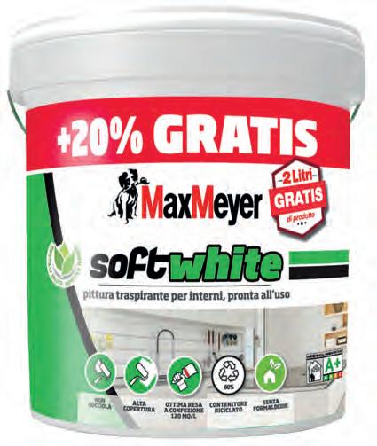 ,95€ “SOFT WHITE” BY MAX MEYER Pittura murale traspirante, pronta all'uso, bianco opaco, ottima resa. SUPERPREZZO 29,95€ 39,95€ -25% IDROPITTURA LAVABILE 10+2 LT GRATIS Ideale per tutti gli ambienti, eccellente punto di bianco. 6,99€ 9,99€ -30% SCHIUMA POLIURETANICA RAPIDA ML.750 99€ 33% SET 3 PENNELLI Con manico in legno. 9,95€ 14,95€ -33% FONDO BIANCO PER LEGNO 0,5 LT Fissa e migliora la tenuta delle pitture, applicazione diretta su tutti i tipi di legno, rapida essicazione 6,99€ 8,95€ -21% KIT EASYTOUCH Composto da bacinella, minirullo Teflon da 11 cm per prodotti all’acqua ed un ricambio. Colore blu o rosso 2,99€ 3,95€ -24% SET 5 TELI ULTRA FINE 4X5 MT RESA 120 MQ/L RESA 120 MQ/L TELESCOPICAASTA 750 ML