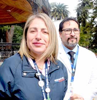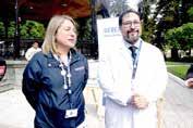 TALCA. En la Plaza de Armas de la capital regional, la seremi de Salud, Carla Manosalva, en compañía del médico Alex Ortiz, encargado de la Campaña de Invierno del Servicio de Salud