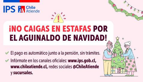 acceder al aguinaldo, no lo haga. Recuerde que el pago es automático. Para información general del aguinaldo, están disponibles los sitios www. ips.gob.cl, www.chileatiende.cl, Call Center 101 o 600 440 0040, redes sociales @ChileAtiende en X, Facebook e Instagram y las sucursales ChileAtiende del IPS en todo el país. Promover medidas preventivas y de autocuidado entre sus usuarios y usuarias también es una prioridad para el Instituto de Previsión Social y su red ChileAtiende, concluyeron las autoridades.