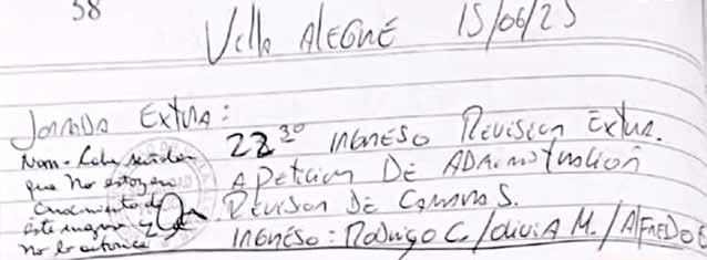 VILLA ALEGRE. Un documento, como una especie de registro de la revisión de cámaras de vigilancia de Villa Alegre, fechada el 15 de junio de 2025, el mismo día que desapareció en la madrugada María Ignacia González, apareció en el matinal de Chilevisión, que genera ciertas dudas, donde una de ella es que el horario actual que dice 22.30 horas, en la parte inferior tiene el horario 3.30 horas y que en el margen superior izquierdo, hay un escrito de la jefa de Seguridad que fue recientemente despedida, al igual que otros cinco funcionarios donde establece que no estaba en conocimiento de lo ocurrido y, que por ende, no lo habría autorizado. En el documento se establece que ingresaron tres personas del gabinete municipal de Villa Alegre, entre quienes se encuentra el ad-