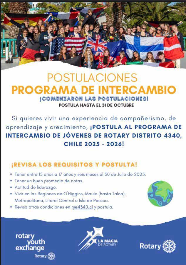 Programa de intercambio. El Rotary Club de Curicó, a través de su presidente Sergio Flores, invita a los interesados a postular al Programa de Intercambio de Jóvenes Distrito 4340, Chile 2025 – 2026. Dentro de los requisitos, los jóvenes deben tener entre 15 y 17 años seis meses, al 30 de julio de 2025; tener buen promedio de notas, actitud de liderazgo, entre otros. Todos los detalles de esta iniciativa pueden encontrarlo en rye4340.cl. El plazo cierra el 31 de octubre de 2024.