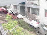 Contra los departamentos de un edificio de Quinta Gaete fueron a estrellarse cerca de 10 vehículos arrastrados por un deslizamiento de un cerro (imagen de TV Contivisión).
