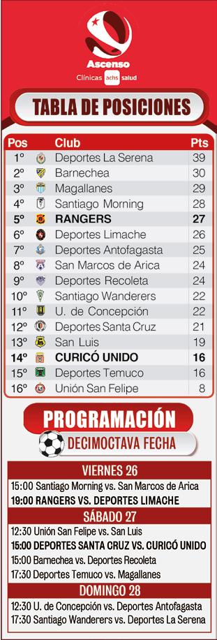 Ignacio Caroca y Mauro González en el mediocampo; dejando en ofensiva a Ignacio Ibáñez, Gustavo Gotti y Gonzalo Reyes. Los rojinegros enfrentarán a Deportes Limache este viernes a partir de las 19:00 horas en el Estadio Fiscal de Talca. En la tabla de posiciones, el local se encuentra con 27 unidades en la 5ta posición, mientras que los tomateros 6tos con un punto menos. Rangers más allá de vencer tiene una obligación psicológica. La de ganar en casa.