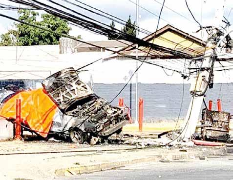 Un vehículo impactó violentamente con un poste del alumbrado público y luego se incendió, quedando completamente destruido.