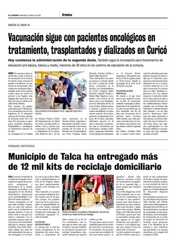 Municipio de Talca ha entregado más de 12 mil kits de reciclaje domiciliario TALCA. Cerca de 12.300 kits de reciclaje ha entregado el municipio en hogares de los sectores surponiente y Bicentenario de la ciudad, destinados al reciclaje y a la segregación de los desechos domiciliarios, fomentando así la sustentabilidad y cuidado del medio ambiente. “Iremos entregando un kit para cada vivienda y esperamos, en estos dos sectores, partir con la recolección segregada durante el mes de marzo. Esta es una gran iniciativa e invitamos a la comunidad a hacerse parte de este proyecto de sustentabilidad para la comuna”, agregó el alcalde, Juan Carlos Díaz. Cabe señalar que serán 40 mil contenedores los que serán entregados en la comu-