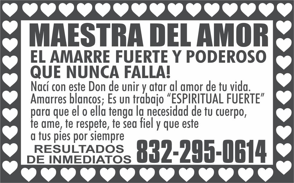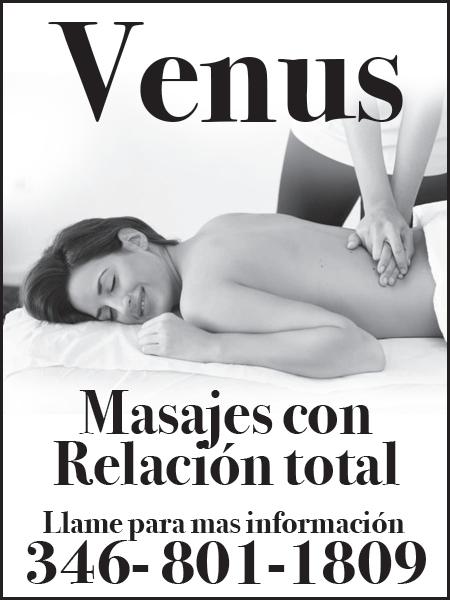 Curandera Esperanza 832-888-8142 Ella le ayudará a resolver sus problemas por más difíciles que estos sean Ella tiene 30 años de experiencia Y ESPECIALISTA EN REUNIR SEPARADOS. CURA ENFERMEDADES DESCONOCIDAS RETIRA ENVIDIAS, SALACIONES Y MALES PUESTOS SE HACEN LIMPIAS, ENDULZAMIENTOS Y AMARRES VENGA HOY MISMO ELLA SE LO DIRÁ TODO 346-243-9635 11 12 17 18 23 24 29 30 337-688-0459 346-283-4836 HILCROFT & 59 SUR Masaje VEN Y DISFRUTA CON CHICAS HERMOSAS GRAN ESPECIAL RELÁJATE 5 CHICAS DIFERENTES TE ESPERAN 346-754-3378 ENTRE ALDINE BENDER Y W. HARDY RD. Y 45 NORTE ABIERTO TODOS LOS DIAS DE 10AM Y 7PM 14 15 16 17 18 20 21 22 23 24 26 27 28 29 30 832-723-1791 BELLAS latinas TE ESPERAN 59 NORTE apertura 713-438-8402 10:00AM - 5:00PM TOTAL RELAJACIÓN 25 26 27 28 Masajes DE LUNES A SÁBADO 45 NORTE Y CROSSTIMBERS 281-891-5127 9:00AM - 8:00PM DE LUNES A DOMINGO CHIMNEY ROCK Y LONG POINT HOUSTON MÚSCULOS CANSADOS ESTRÉS Isabel MASAJISTA INDEPENDIENTE www.bellacuzcoperu.com