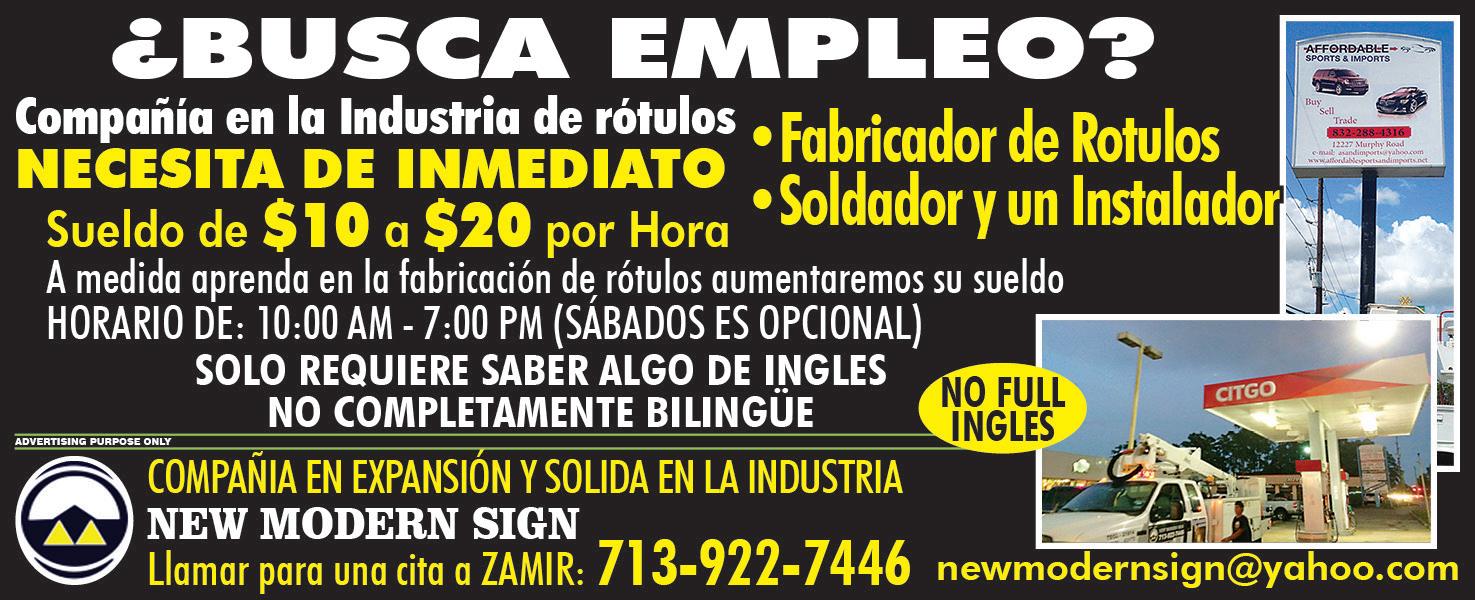 Trabajo de bodega en general, operadores, empacadoras y mantenimiento eléctrico y mecánico. vacaciones pagadas y días festivos más seguro de vida. Aplique en 9349 Baythorne Dr. Houston, TX 77041 o llame al 832-782-5659.