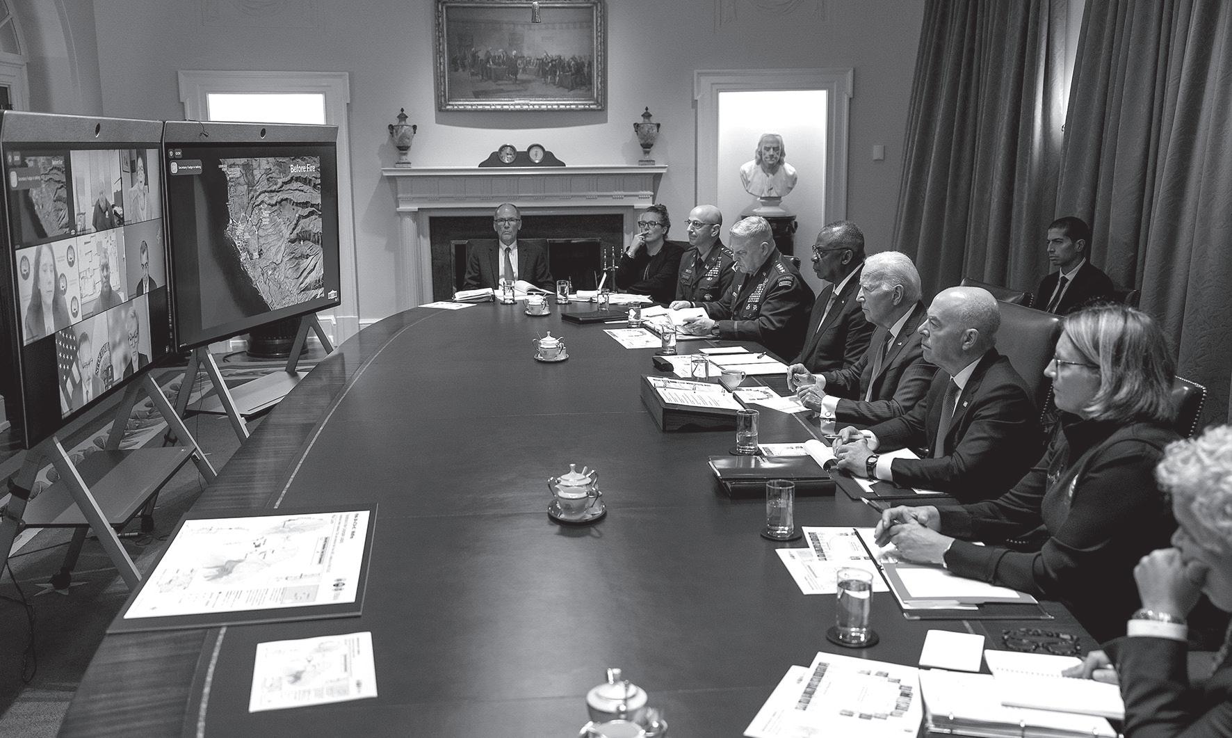 El presidente Joe Biden, publicó esta imagen con su equipo de trabajo, supervisando a larga distancia los trabajos de ayuda y recuperación luego de los incendios en Hawái. “Los miembros de mi gabinete que lideran los esfuerzos federales de recuperación y reconstrucción”, escribió.