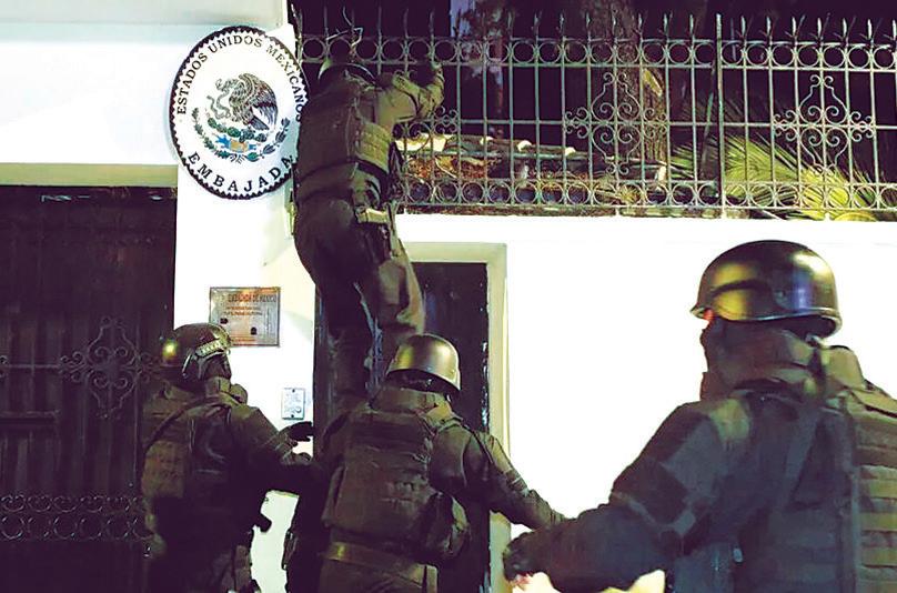 Momentos en que policías ecuatorianos entran a la embajada de México en Ecuador.