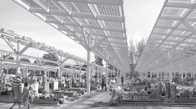 La ciudad de Saint-Joachim está situada cerca del pantano de Brière, una turbera que se inunda fácilmente de agua. El cementerio local se encuentra a 0 pies sobre el nivel del mar y el agua estancada se ha convertido en un problema. El alcalde propuso cubrir el cementerio para desviar el agua de lluvia a tanques colectores para regar el césped alrededor del cementerio y el complejo deportivo cercano en los meses secos de verano. También se propusieron paneles solares para la cobertura superior, que de otro modo sería básica. Su cementerio se ha convertido en una fuente de energía solar. Cada residente recibió una carta explicando la propuesta y pidiendo su opinión sobre la idea y a todos les gustó y se determinó un plan de energía compartida.
