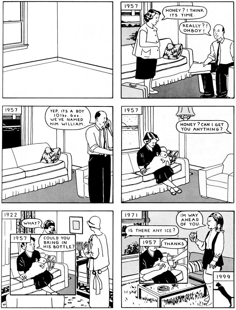 “Here” primero fue una tira cómica de 6 páginas de Richard McGuire publicada en Raw Volume 2 #1 en 1989. En 2010, McGuire anunció una versión en novela gráfica “Here”, ampliada a 300 páginas, a todo color. Fue publicada por Pantheon Books en diciembre de 2014.