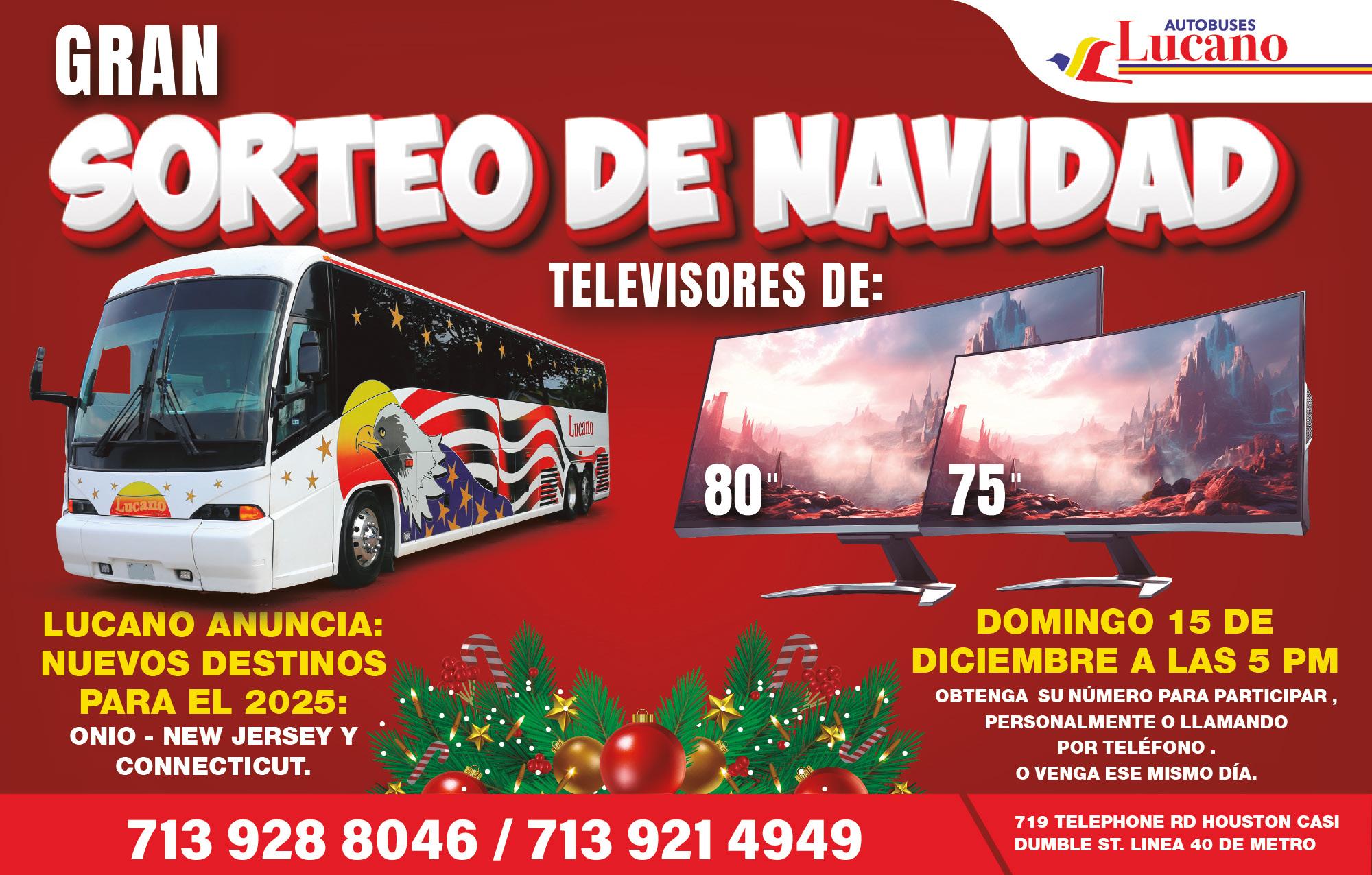 Autobuses Lucano Anuncia ¡SORTEO DE NAVIDAD! UN TELEVISOR 75/80 pulgadas!! Domingo 15 de Diciembre a las 5 pm Obtenga su número para participar personalmente o llamada por teléfono o Venga ese mismo día! más información tel 713-921-4949 // 832-798-9608