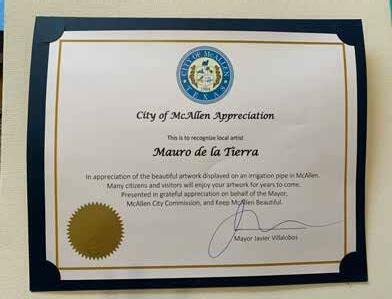 Local painter and previous La Prensa feature artist Mauro de la Tierra was recently awarded by the city of McAllen, Texas for his contributions to the Keep McAllen Beautiful project, an affiliate of Keep America Beauti ful. Using an array of spray paints and acrylics, Mauro completed the piece, titled “Amor Divino”, in May of this year on one of over 200 irrigation pipes located within the city.