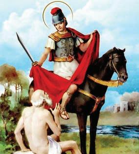 Moved with compassion Martin drew his sword from its scabbard, Martin cut his great woolen cloak in two pie ces, gave one half to the beggar, and wrapped himself in the other. Martin bound his wounds pouring oil and wine. He then puts the poor man on his own horse, takes him into town to an inn and took care of him. The next day when Martin departed he gives to the innkeeper some money and said to him, 'Take care of him. Whatever you spend beyond that, I will repay you when I return.'