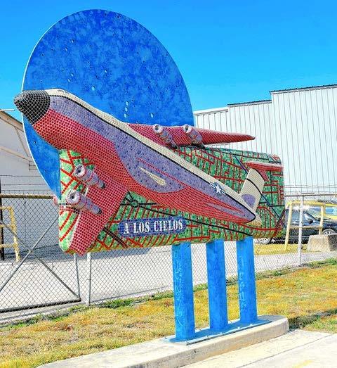 mission gave Alvarado his first opportunity to create large-scale concrete mosaic art. Soon after, in the first decade of 2000, Alvarado completed numerous public art works commissioned by Public Art San Antonio including three eleven foot tall two-sided billboard-like sculptures for the southside sidewalks on Zarzamora Street. Alvarado’s sculptures are of a personal nature: one depicts his parents dancing “Hoy Bailamos” “Today We Dance” where the popular Arturo’s Dance Hall once stood on Zarzamora Street. A second sculpture features a ‘57 Chevy flying off to the moon. The third panel across the street shows a C-5 air cargo airplane [A Los Cielos, “To the Skies”], a tribute to the planes that his father worked on while employed at Kelly Air Force Base.