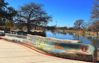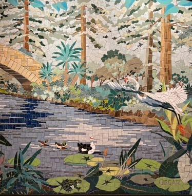 creative work revolved around faux wood concrete sculptures similar to those found at Brackenridge Park. Alvarado learned about concrete work from Cortez, and taught himself the art of mosaics, which involves placing small colored glass or porcelain pieces set in concrete to form sculptures and images. Before becoming a professional artist, Alvarado learned different art forms by observation and thoughtful conversations with established professionals. Mosaic work involves a complex process requiring the right quality and quantity of concrete and thoughtful notions about design. Al-