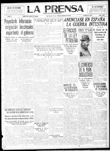 La Prensa was a Spanishlanguage newspaper founded by Ignacio Lozano in 1913 in San Antonio, Texas. The newspaper aimed to keep the Mexican-American population in Texas informed of current events in Mexico and provide a connection to their home country's language and culture. La Prensa quickly became one of the most widely-circulated Spanish-language newspapers of its time, with circulation stretching from northern Texas to Mexico and Mexican émigré communities throughout the United States and Central America.