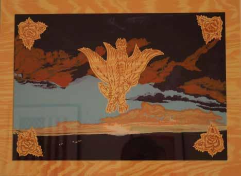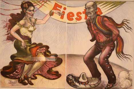 Jiménez’s “Jarabe” print in the SAMA show originated with a 1985 U.S. General Service Administration commission for a fiesta sculpture at the Otay Mesa border station near San Diego, California. In 1985, Jiménez produced five Jarabe sculptures and created a series of lithographic prints. The “Jarabe” print in the SAMA exhibit shows a