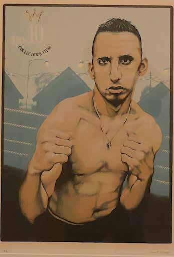 Delilah Montoya’s print, “Smile Now, Cry Later,” portrays another fighter, Terri “Lil Loca” Lynn Cruz, the International Female Boxers’ Association Bantamweight Champion. SAMA curator Meador explained, “Defying traditional roles, Montoya sees women boxers as warriors who do not conform to societal expectations.”