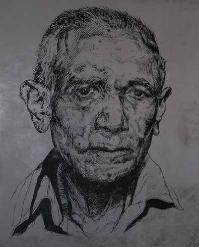 In addition, a series of black and white lithographs by Luis Jimenez showcases the struggles of immigrants seeking a better life across the border and the devastating impact of war. Next to this grouping is Adriana Corral’s English transla-