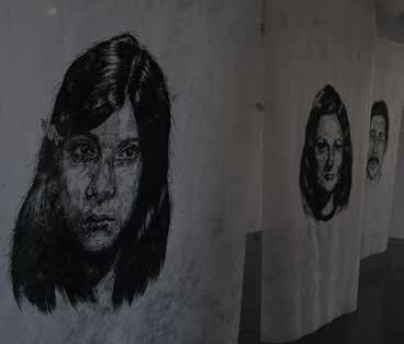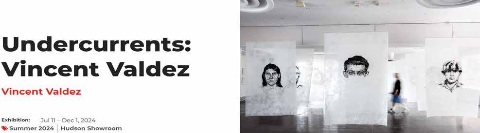 second-floor Hudson Showroom. Guest Curator Zhaira Constiniano of the Art League Houston noted that Valdez’s work “features twenty-one suspended banners depicting haunting portraits of individuals who have disappeared in Central and South America since the 1970s.”