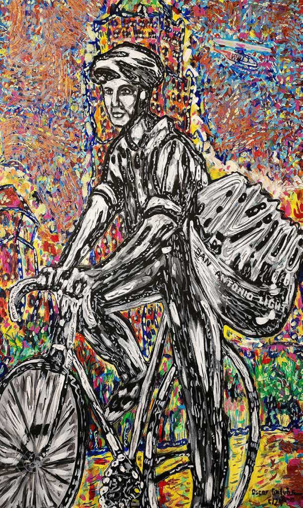 In this exhibit, lifelong visual artists Oscar A. Galván Jr. and Martin Emmanuel Rangel work together to give new life to the old practice of spreading the news. The exhibit pays homage to the artists’ ancestors and nostalgically explores the aesthetics of past eras. The artists depict newspaper delivery boys across generations and time periods, blending past and present to share a unique perspective of the evolution of the time-honored tradition of delivering the news. Both artists were born and raised in San Antonio and, through this exhibit, they evoke memories of San Antonio landmarks in the West Side and Downtown, like Joske’s and Galván Pharmacy. The artists draw on emotions by superimposing newspaper boys of the past into present-day settings of San Antonio’s city center, historic places, and various long-standing neighborhoods. They use color and contrast to juxtapose the aesthetics and style of the past with today’s culture and
