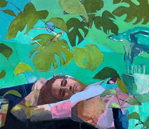 Jennifer Agricola Mojica paints vibrant, ephemeral spaces that offer belonging in a discordant world. Her superimposed compositions cross genres of abstraction and figurative painting. By stripping and rebuilding thick layers of paint, Agricola Mojica creates visual tensions that allude to fractured memory and the deception of time. In The Sixteen Dollar Cake,a sleeping figure is positioned under a lush canopy of monstera plants as lingering smoke rises from the wicks of extinguished birthday candles, alluding to memories and the passage of time.