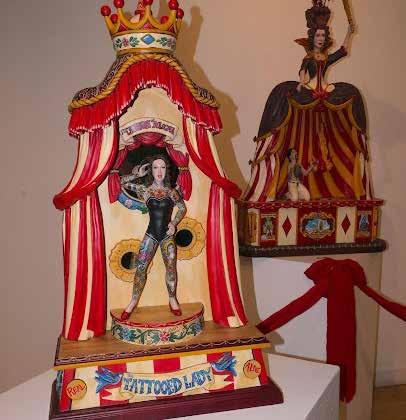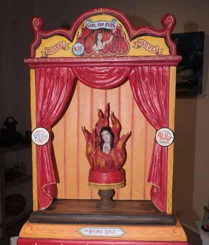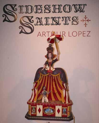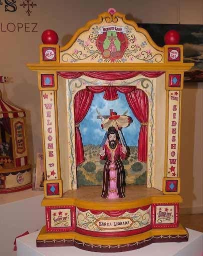 López’s “Sideshow Saints” exhibit at King Gallery is an amazingly creative contemporary reimagining of the sacred account of Christian saints. The bold and colorful figures of the eight saints he chose for the exhibit are placed as part of a circus sideshow. St. Catherine of Bologna, for example, is portrayed as a carnival sideshow “Tattooed Lady” standing in a small tent with a religious crown on the top of the tent. Lopez is a meticulous craftsman and is highly proficient in understanding and appreciating the New Mexican santero tradition—particularly bulto making (hand - carved and painted wooden sculptures). The