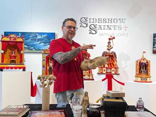 Arthur Lopez's electrifying exhibit at King Gallery during the Spanish Market weekend in Santa Fe drew an enthusiastic crowd over a two-day celebration July 25-26, 2025. Arthur Lopez is considered a contemporary wood santero sculptor, and his work in the King Gallery exhibit blended circus-related iconography with traditional santero religious figures. The results were dazzling in creativity and figurative precision. Lopez, known for expanding traditional santero boundaries, has gained national and international recognition over the past decade. However, Arthur Lopez’s work is rooted in centuries-old New Mexico art traditions.