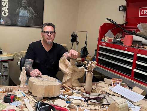 santero tradition of artists such as Barela. He is largely selftaught. He grew up in Santa Fe and, as a teen, generally focused on drawing and sketching. In the early 1990s, Lopez studied graphic design at Eastern New Mexico College, and after graduation, found work as a designer. He was about to take a design post with Macy’s in New York City when his father fell ill, and he returned to Santa Fe to help care for him. In Santa Fe, he met his future wife, Bernadette Marquez, and Bernadette encouraged him to pursue his passion for art and remain in New Mexico.