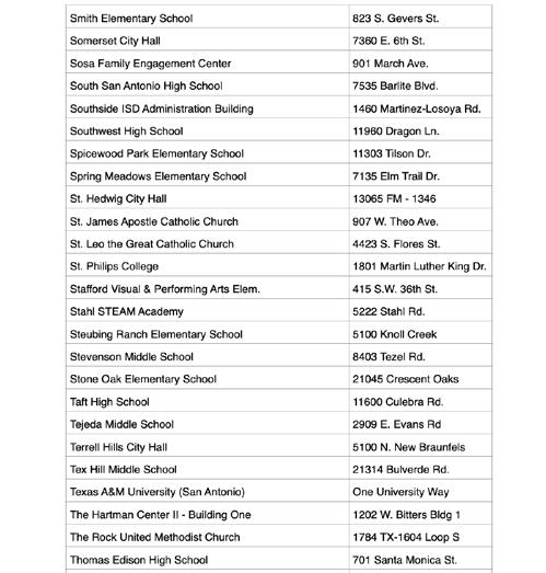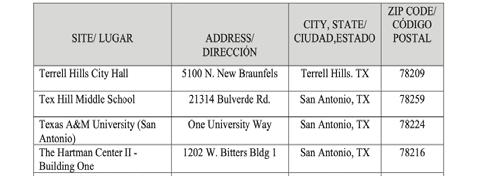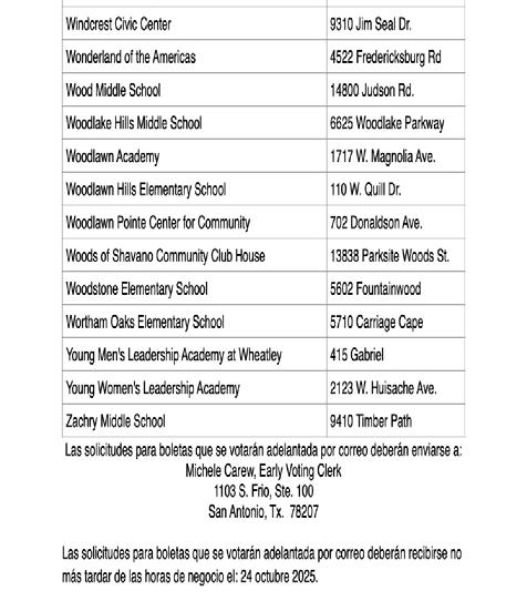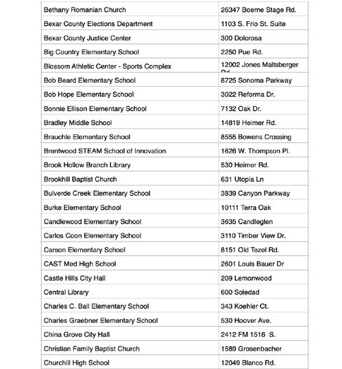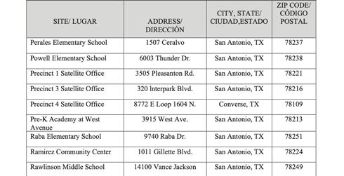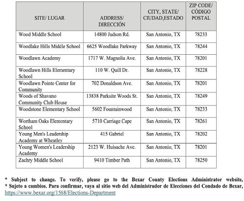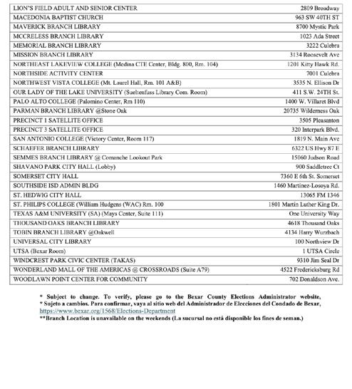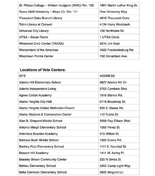 (b) The address for the Early Voting Clerk and the address for application for ballot by mail is Michele Carew, Bexar County Elections Administrator, 1103 S. Frio, Suite 100, San Antonio, Texas 78207, and the Early Voting Clerk may be reached at the following: (i) Telephone: (210) 335-8683, (ii) Email: bexarcountyelections@bexar.org, and (iii) Website: https://www.bexar.org/1568/Elections-Department.