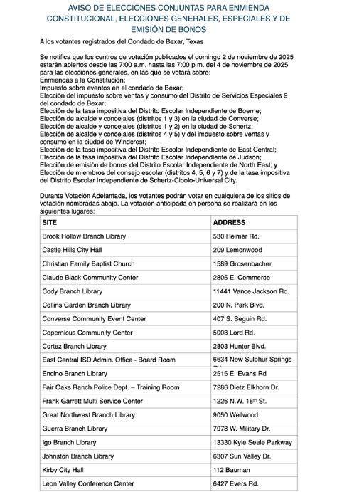 POR EL PRESENTE SE NOTIFICA que el Tribunal de Comisionados del Condado de Bexar, Texas, ha convocado una elección que se llevará a cabo dentro del Condado el martes 4 de noviembre de 2025. A continuación se muestra una copia sustancial de la Orden adoptada por el Tribunal de Comisionados que convoca la elección. DADO ESTE 14 de octubre de 2025. /f/ Lucy Adame-Clark, Secretaria del Condado, Condado de Bexar, Texas.