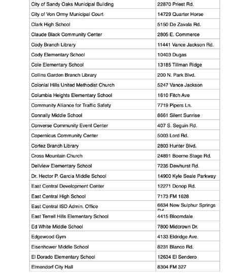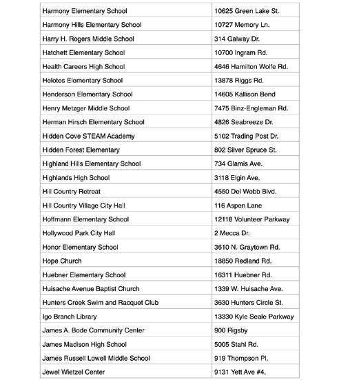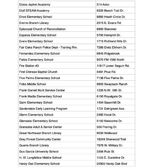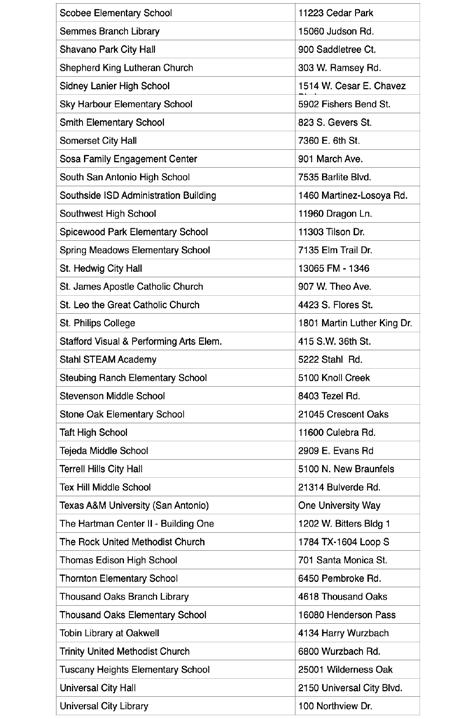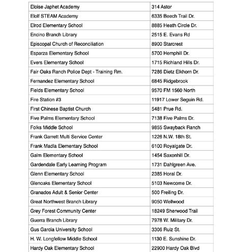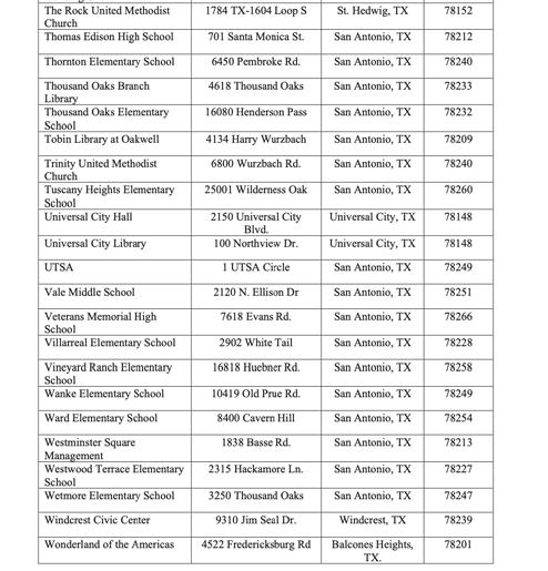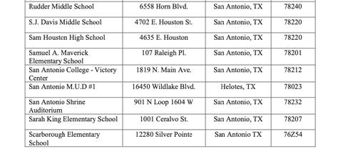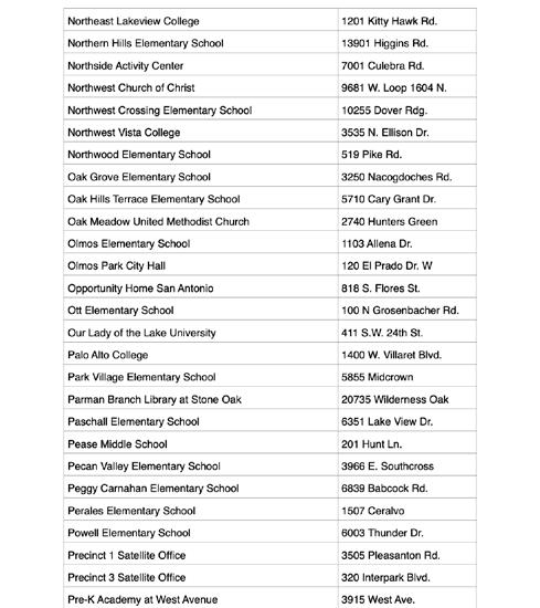 SECTION 5. Election Precincts, Voting Locations, and Voting Hours on Election Day. The polling places for the Election are hereby designated to be those locations identified by Michele Carew, Bexar County Elections Administrator (the “Elections Administrator”). Voting on Election Day shall be conducted at the countywide polling locations designated on Exhibit A attached hereto, with such locations being incorporated herein by reference and made a part hereof for all purposes; provided, however, such locations may be changed if so directed by the Elections Administrator without further action by the Court and without amendment of this Order. The Elections Administrator is hereby authorized and directed to make such changes in precinct numbers and polling locations as may be necessary for the proper conduct of the Election, without further action by