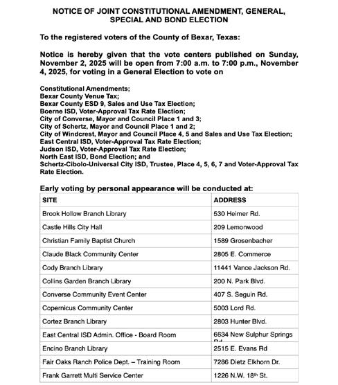 NOTICE IS HEREBY GIVEN that the Commissioners Court of Bexar County, Texas has called an election to be held within the County on Tuesday, November 4, 2025. Below is a substantial copy of the Order adopted by the Commissioners Court calling the election. GIVEN THIS October 14, 2025. /s/ Lucy Adame-Clark, County Clerk, Bexar County, Texas.
