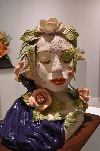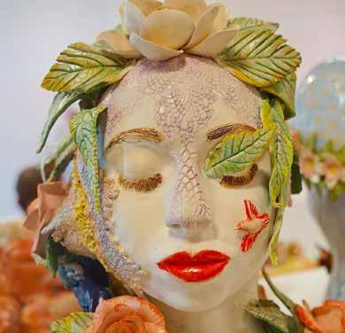 of meticulously formed, glazed and fired details such as flowers, butterflies, shells, branches, environments, and many other details to complete her visual narrative.”