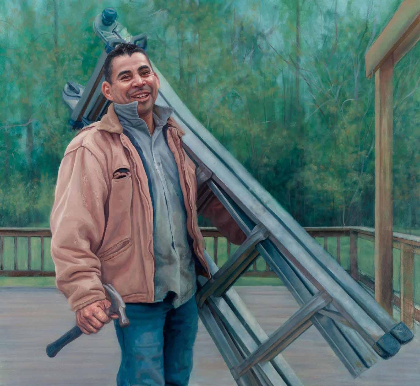 Born in Mexico and raised in Nacogdoches, Texas, Morales creates large-scale portrait paintings that elevate and dignify Latino immigrant laborers throughout the United States. Her subjects— construction workers, dishwashers, cleaning staff, and agricultural laborers—are portrayed with an emotional depth that reveals both pride and vulnerability. A